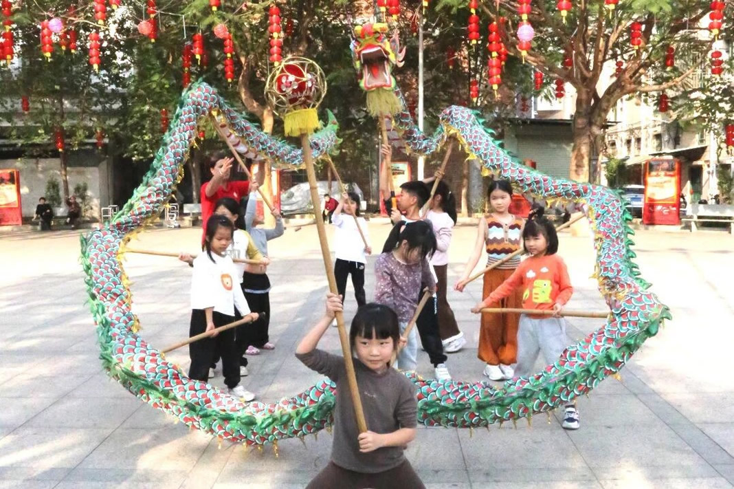 孩子們還參與非遺尋根主題活動,近距離體驗舞龍技藝,感受家鄉傳統文化魅力,在沉浸式體驗中傳承非遺文化。