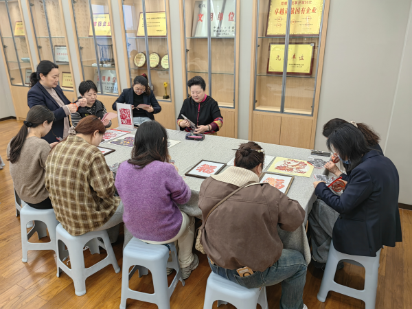 活動現場暖意融融,點茶的余香與咖啡的醇香在這一刻碰撞,伴隨著歡聲笑語大家圍坐在一起,認真聆聽非遺老師的講解,沉浸式體驗手工的獨特魅力。世界非遺項目傳統宋錦的展示,從每一位女同胞們指尖劃過的是從繅絲、染色到成錦20多道工序,來自一千多年前宋朝的頂級工藝,大家用這色調雅致細膩的布料靜心創作,用心感受著中華傳統文化的博大與精深;來自剪紙藝術世家,鄭州市非物質文化遺產剪紙代表性傳承人楊征老師一把剪刀,一張紅紙,便把中國人最樸素的浪漫與匠心躍然紙上。這源于民間,長于煙火的千年傳承,以最簡約的形式,用平凡的紙張,綻放出永不褪色的東方大美;河南省民間文藝家協會會員李茜老師,作為非遺傳承人,潛心植物色染,同女同胞們一起現場制作,一扎一染,一藍一白,大家在松開繩結的那一刻,藍白交織,暈痕朦朧,每一道紋路都是獨一無二的驚喜。藍是天青,白是云影,布是歲月,紋是心意,無不透著別有的東方韻味;河南是宋代點茶的核心舞臺和文化中心,是千年宋韻的中原根脈。對茶道感興趣的女同胞們,“天青汝瓷盞,雪沫點茶湯”隨著老師的示范一招一式都學得格外的認真。茶器、茶人、茶論,一盞點茶,千年風雅體現的淋漓盡致。這次活動的每一項非遺都是中華文脈的生動載體,這種以非遺市集為課堂,以匠心為教材,讓中華傳統文化可觸摸、可體驗、可傳承體驗活動,大家沉浸其中,意猶未盡。