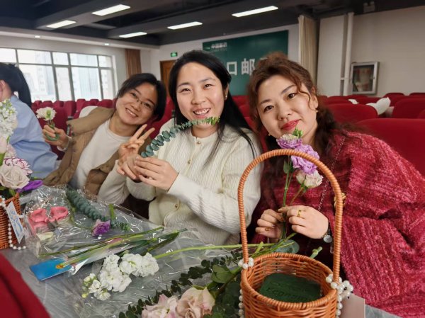 活動(dòng)現(xiàn)場花香四溢、暖意融融。工會(huì)提前準(zhǔn)備了玫瑰、康乃馨、洋桔梗、尤加利葉等豐富花材與工具,并特邀專業(yè)花藝?yán)蠋煬F(xiàn)場授課。老師以通俗易懂的語言,細(xì)致講解花材特性、色彩搭配、修剪技巧與造型構(gòu)圖,通過示范演示,讓大家快速掌握插花要點(diǎn)。