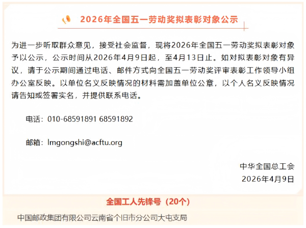 4月9日,2026年全國(guó)工人先鋒號(hào)評(píng)選公示名單正式發(fā)布,云南郵政大屯支局憑借突出的工作業(yè)績(jī)、過硬的團(tuán)隊(duì)作風(fēng)、鮮明的先鋒本色成功入選公示名單。