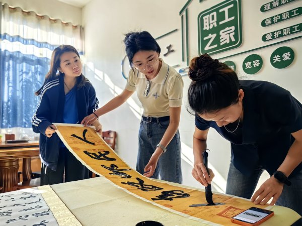 老職工老徐鋪開毛氈,倒上墨汁,準備教年輕員工小呂和小喻寫毛筆字。這是職工之家“書法角”的日常——只要不忙,老徐都會在這里待上一會兒,寫寫字,也教教年輕人。